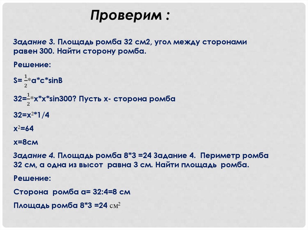 Проверим :Задание 3. Площадь ромба 32 см2, угол между сторонами