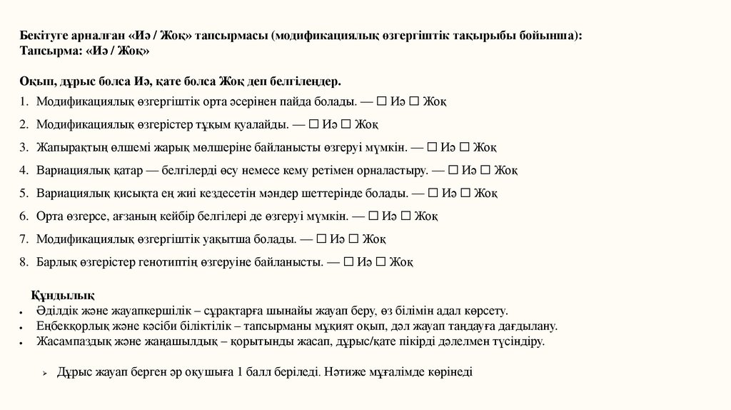 Бекітуге арналған «Иә / Жоқ» тапсырмасы (модификациялық өзгергіштік тақырыбы бойынша):Тапсырма: «Иә / Жоқ»