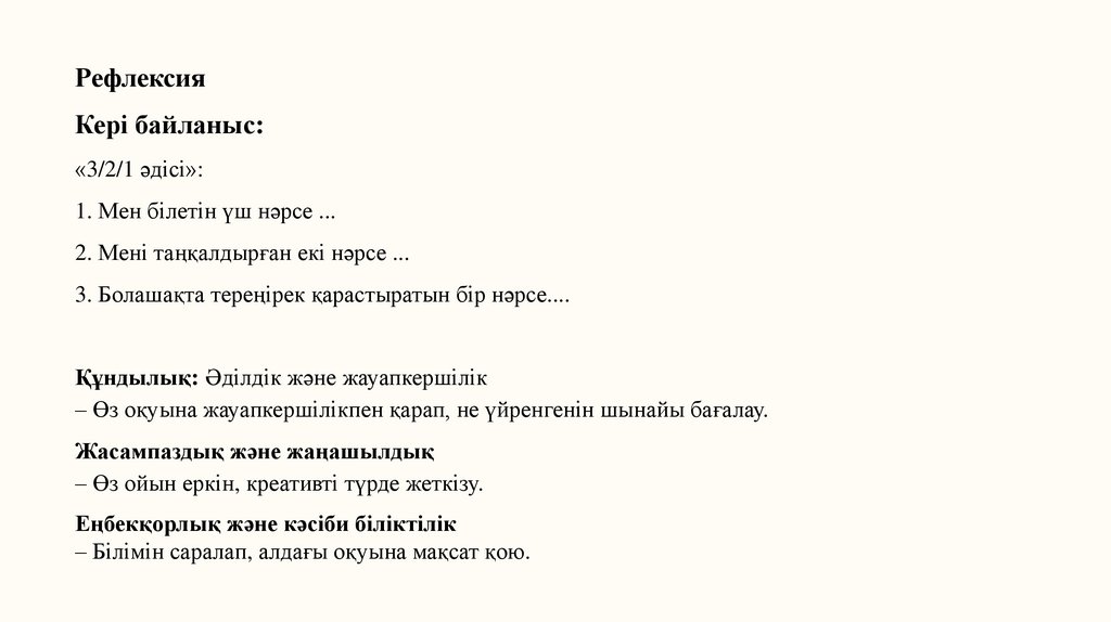 – Өз оқуына жауапкершілікпен қарап, не үйренгенін шынайы бағалау.