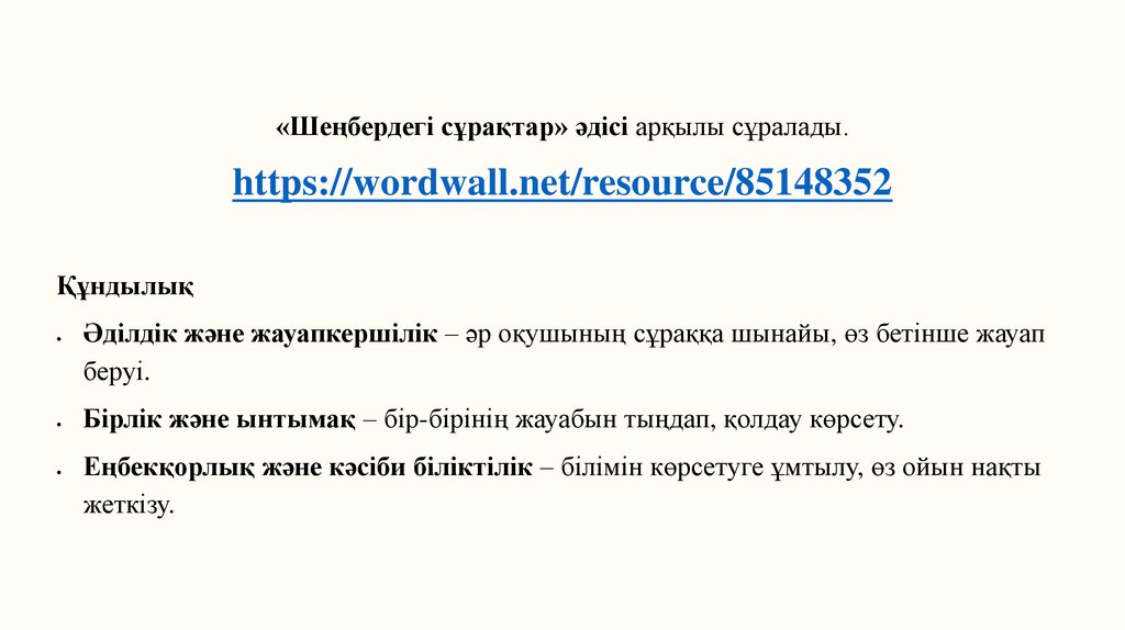 «Шеңбердегі сұрақтар» әдісі арқылы сұралады.https://wordwall.net/resource/85148352