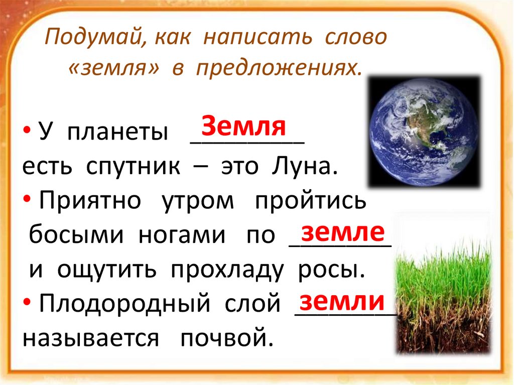 Подумай, как написать слово«земля» в предложениях.