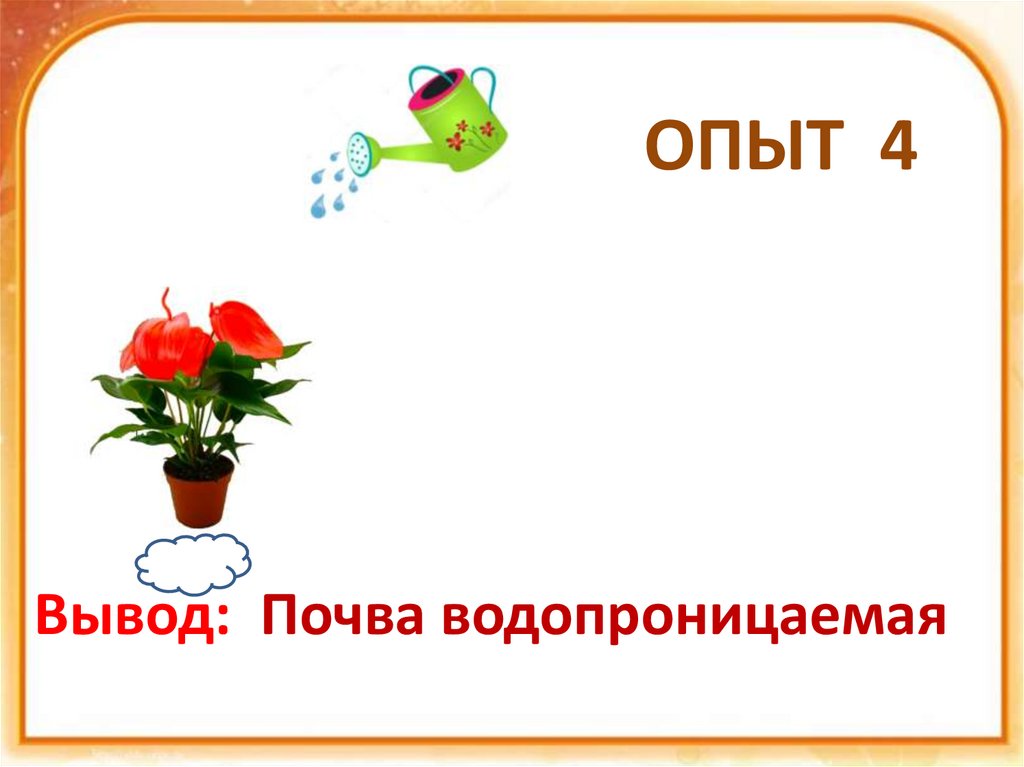 ОПЫТ 4Вывод: Почва водопроницаемая