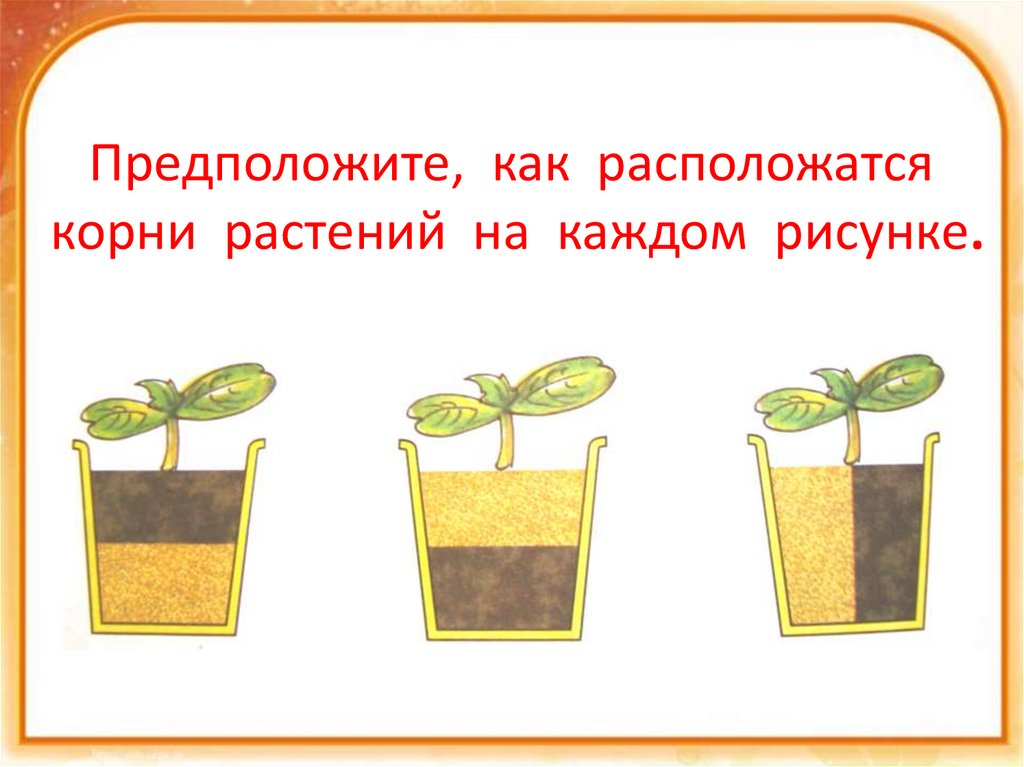 Предположите, как расположатсякорни растений на каждом рисунке.