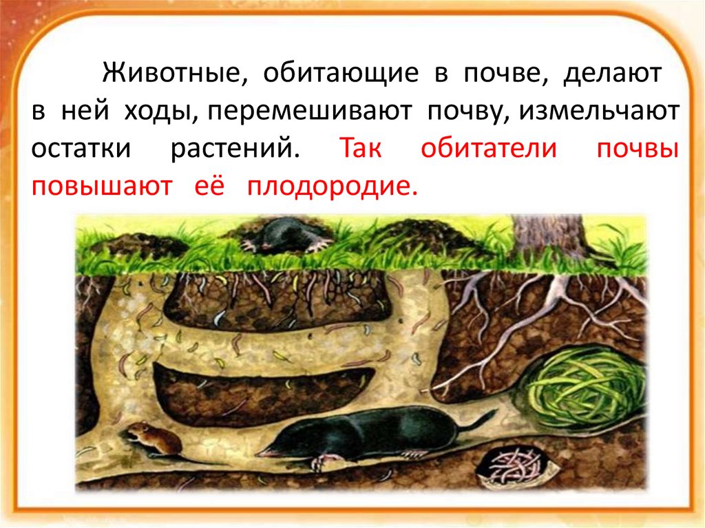 Животные, обитающие в почве, делаютв ней ходы, перемешивают почву, измельчают