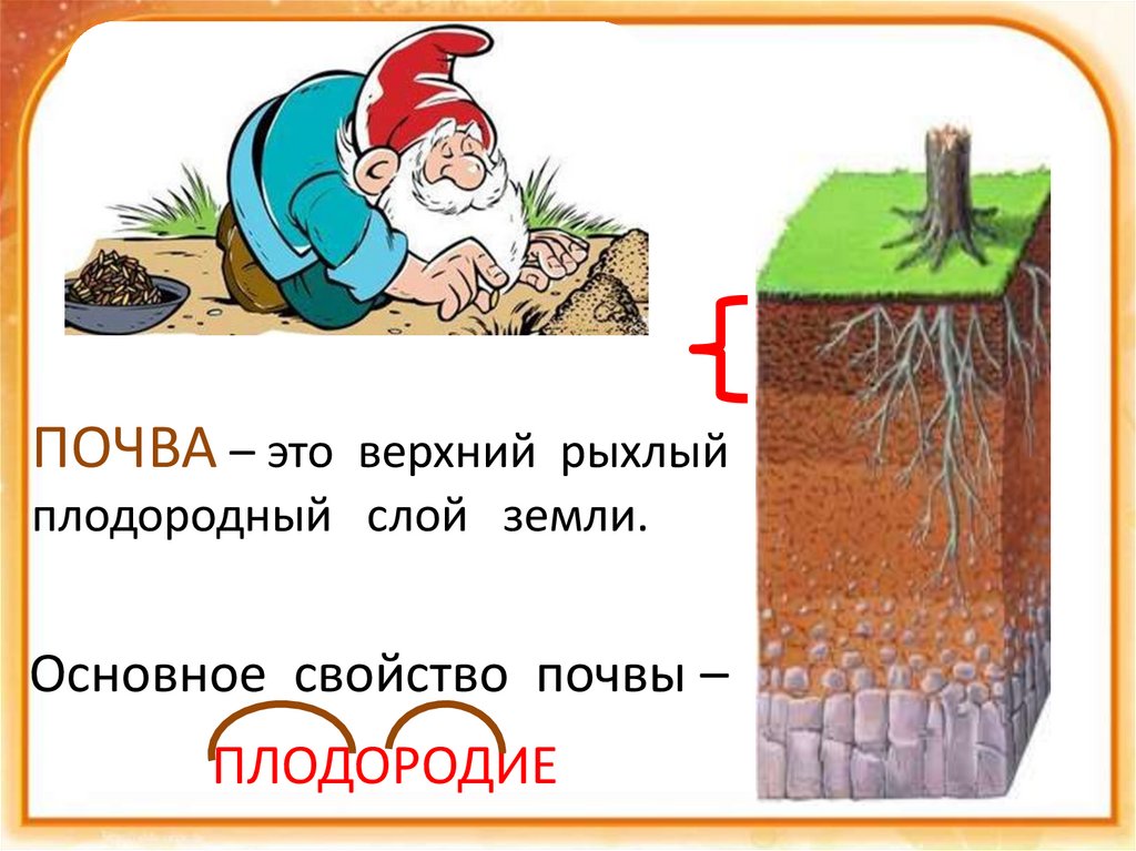 ПОЧВА – это верхний рыхлыйплодородный слой земли.