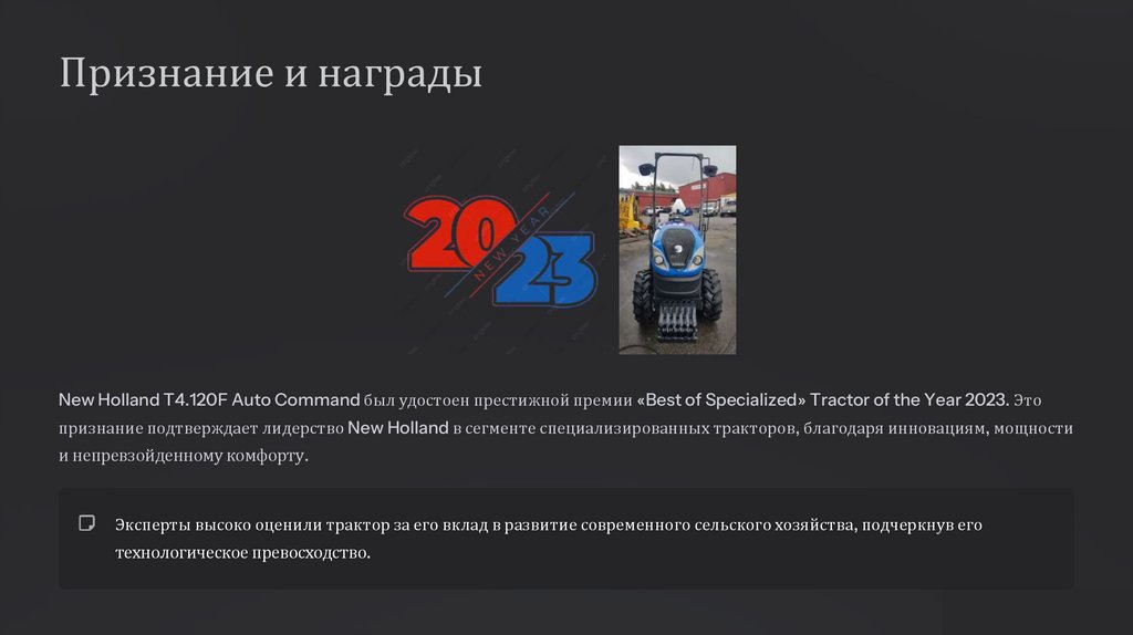 Признание и наградыNew Holland T4.120F Auto Command был удостоен престижной премии «Best of Specialized» Tractor of the Year 2023. Это