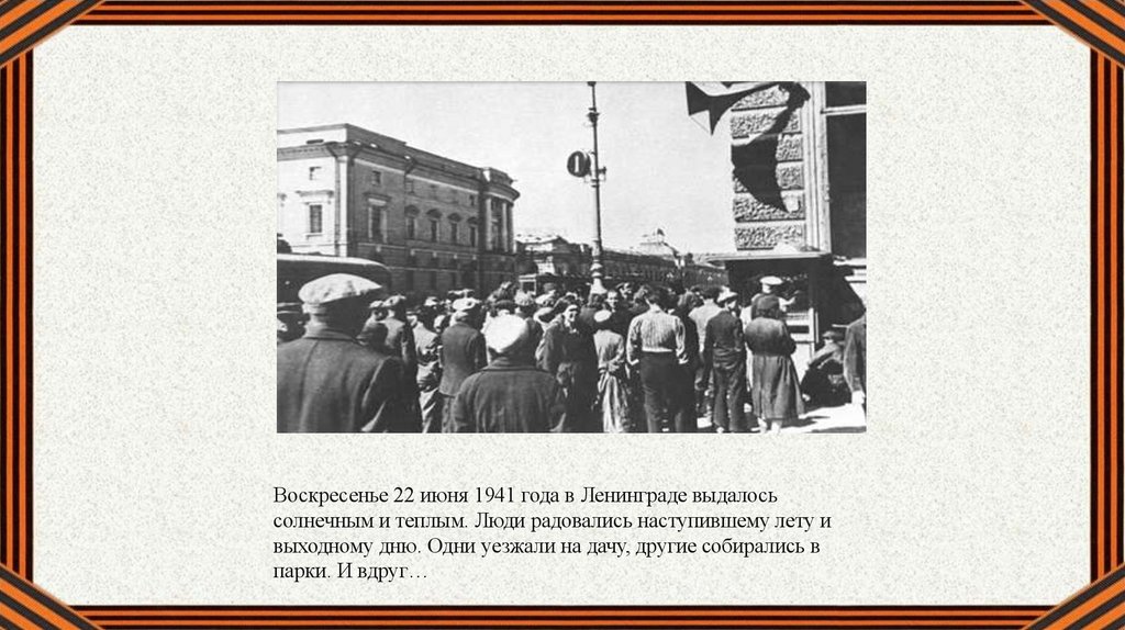 Воскресенье 22 июня 1941 года в Ленинграде выдалосьсолнечным и теплым. Люди радовались наступившему лету и