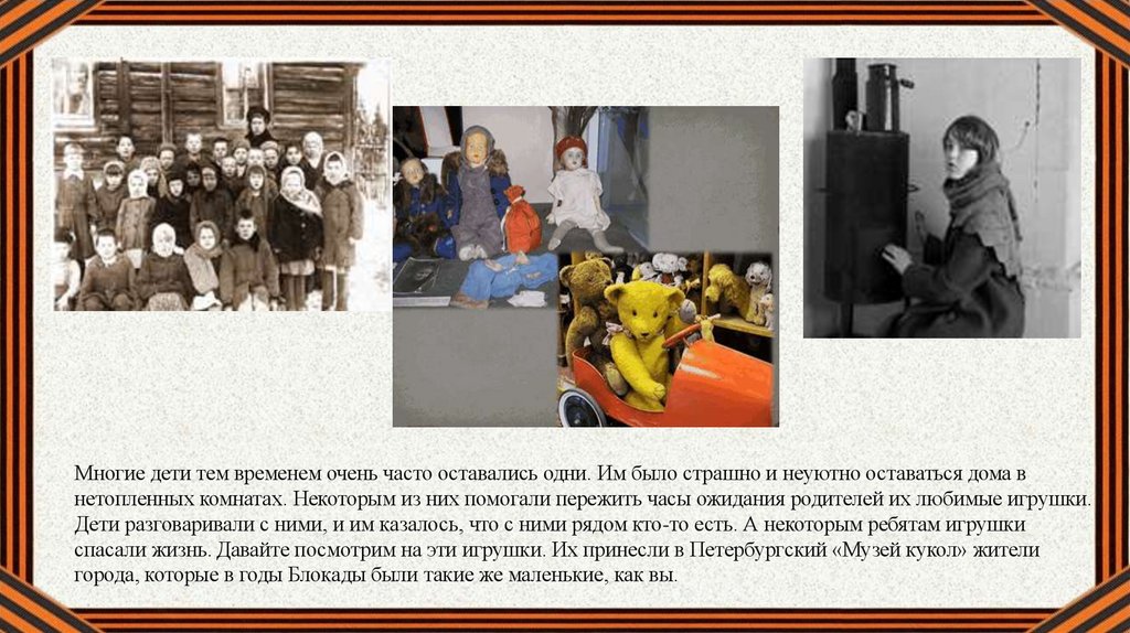 Многие дети тем временем очень часто оставались одни. Им было страшно и неуютно оставаться дома внетопленных комнатах. Некоторым из них помогали пережить часы ожидания родителей их любимые игрушки.