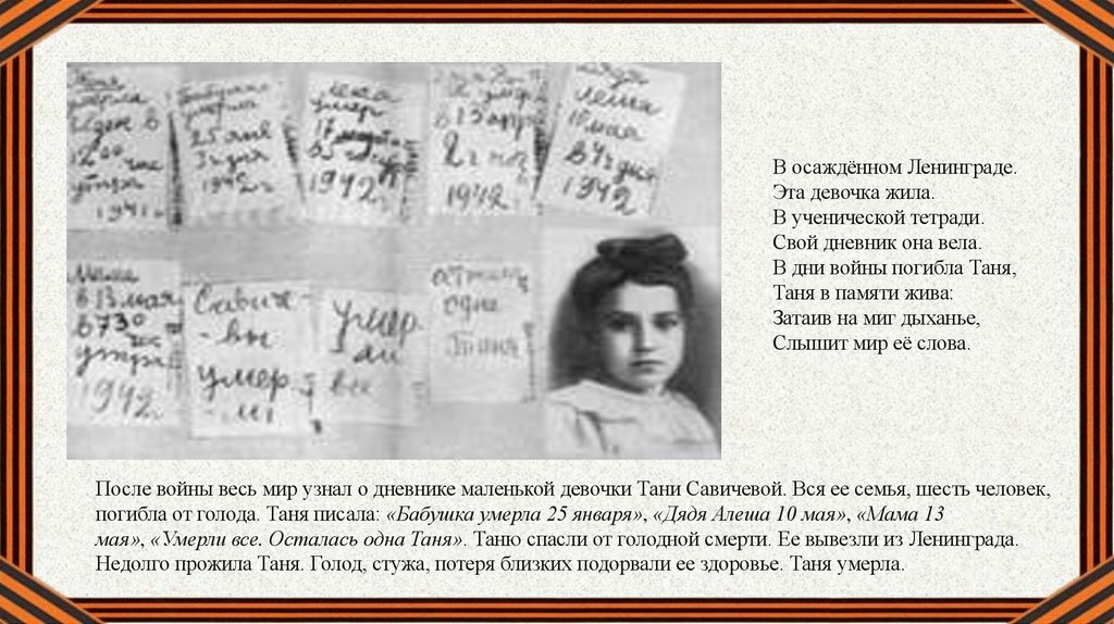 мая», «Умерли все. Осталась одна Таня». Таню спасли от голодной смерти. Ее вывезли из Ленинграда.