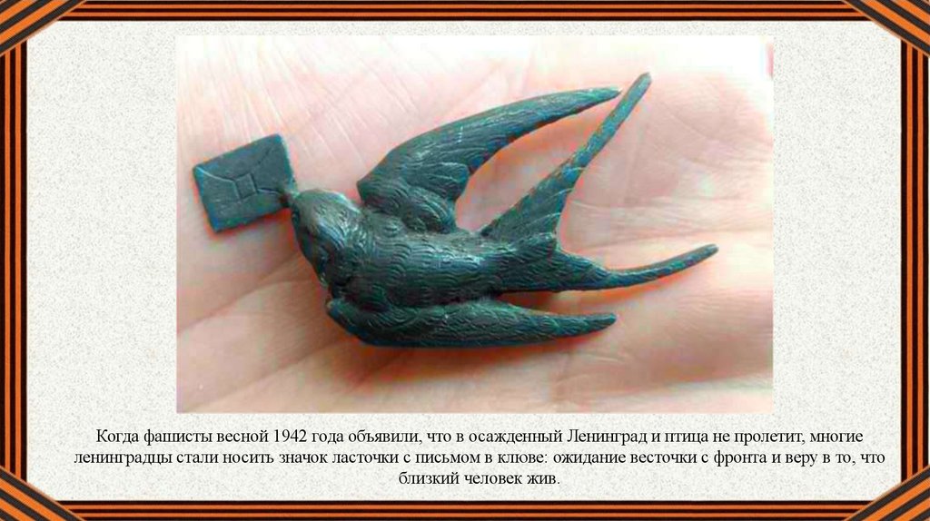 Когда фашисты весной 1942 года объявили, что в осажденный Ленинград и птица не пролетит, многиеленинградцы стали носить значок ласточки с письмом в клюве: ожидание весточки с фронта и веру в то, что