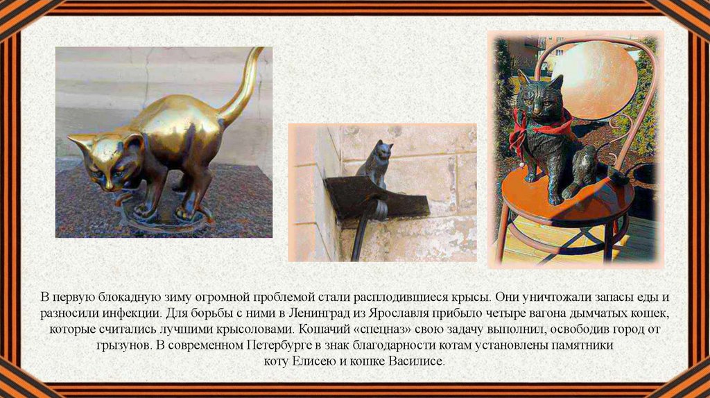 грызунов. В современном Петербурге в знак благодарности котам установлены памятники