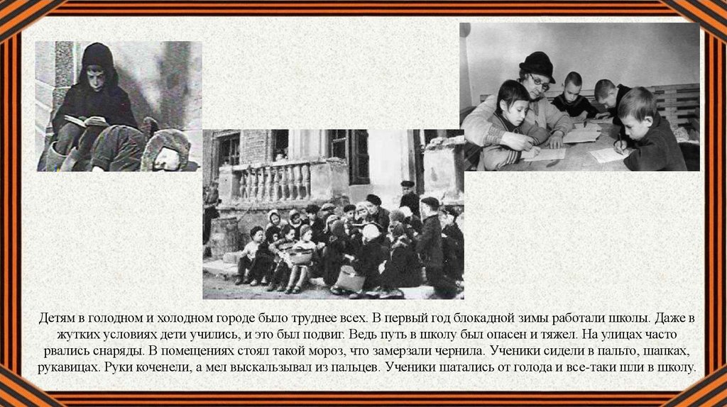 Детям в голодном и холодном городе было труднее всех. В первый год блокадной зимы работали школы. Даже вжутких условиях дети учились, и это был подвиг. Ведь путь в школу был опасен и тяжел. На улицах часто