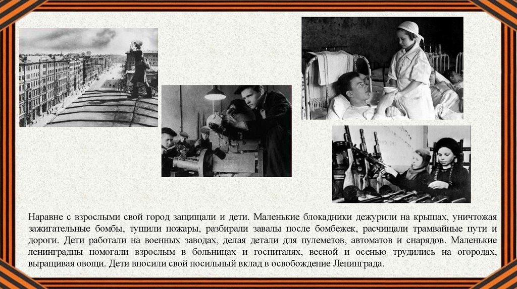 Наравне с взрослыми свой город защищали и дети. Маленькие блокадники дежурили на крышах, уничтожаязажигательные бомбы, тушили пожары, разбирали завалы после бомбежек, расчищали трамвайные пути и