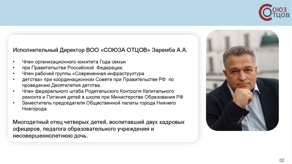 Исполнительный Директор ВОО «СОЮЗА ОТЦОВ» Заремба А.А.Член организационного комитета Года семьи