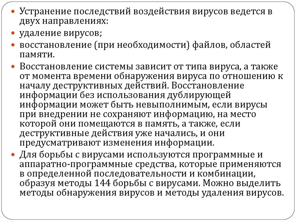 Устранение последствий воздействия вирусов ведется вдвух направлениях:
