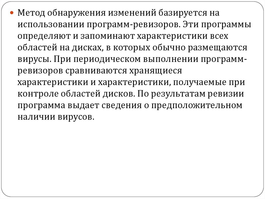 Метод обнаружения изменений базируется наиспользовании программ-ревизоров. Эти программы