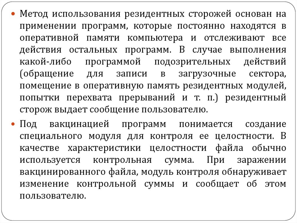 Метод использования резидентных сторожей основан наприменении программ, которые постоянно находятся в