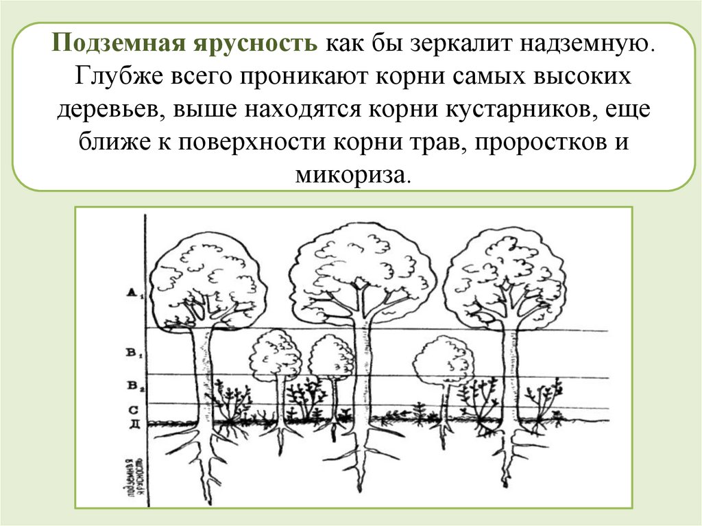 Подземная ярусность как бы зеркалит надземную.Глубже всего проникают корни самых высоких