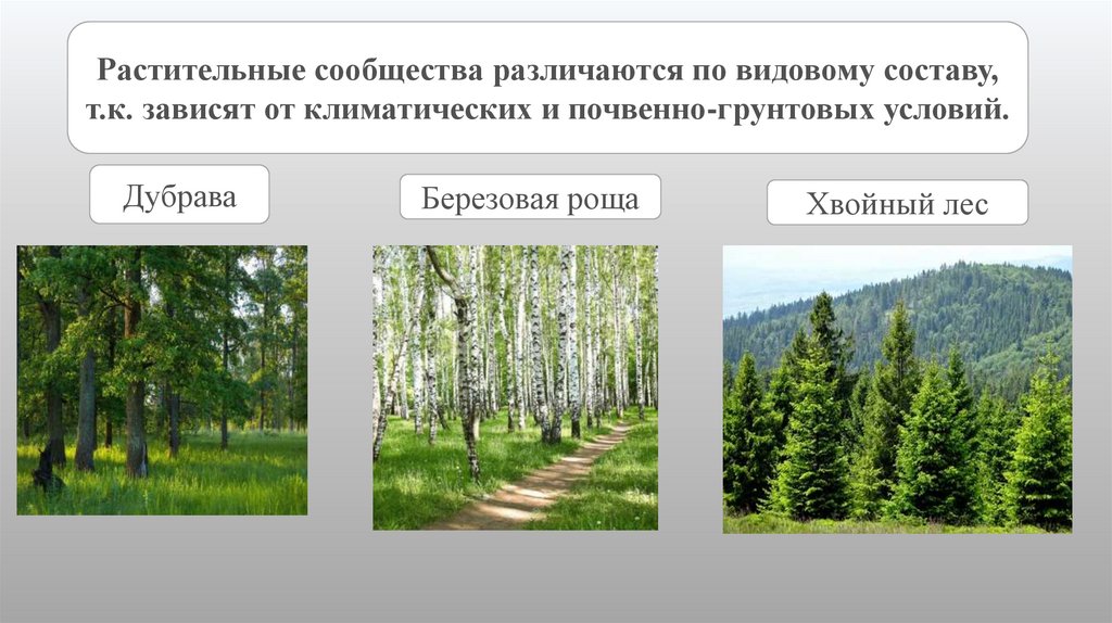 Растительные сообщества различаются по видовому составу,т.к. зависят от климатических и почвенно-грунтовых условий.