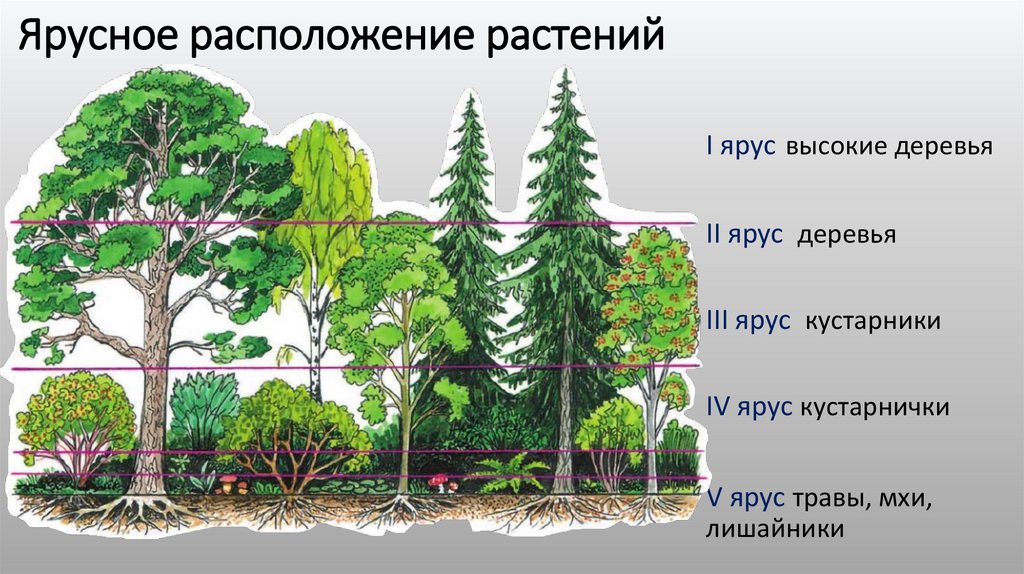 Ярусное расположение растенийI ярус высокие деревья