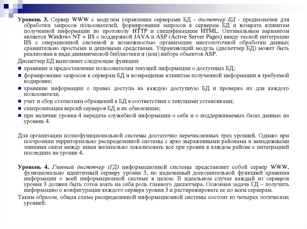 Уровень 3. Сервер WWW с модулем управления серверами БД - диспетчер БД - предназначен дляобработки запросов пользователей, формирования запросов к серверам БД и возврата клиентам