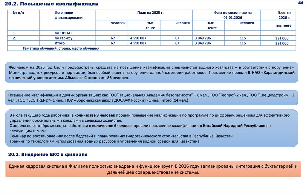 Министра водных ресурсов и ирригации, был особый акцент на обучение данной категории работников. Повышение прошли В НАО «Карагандинский