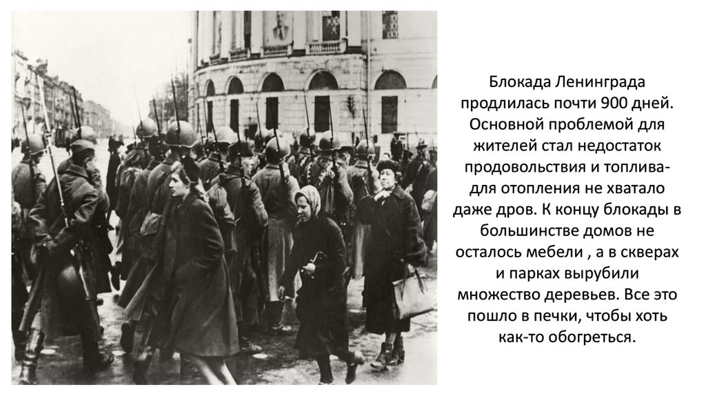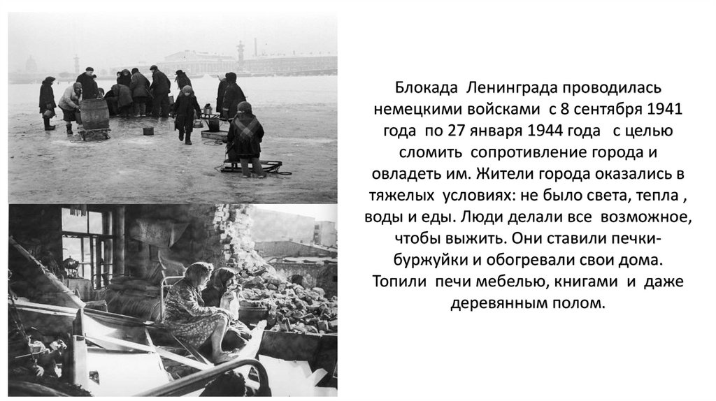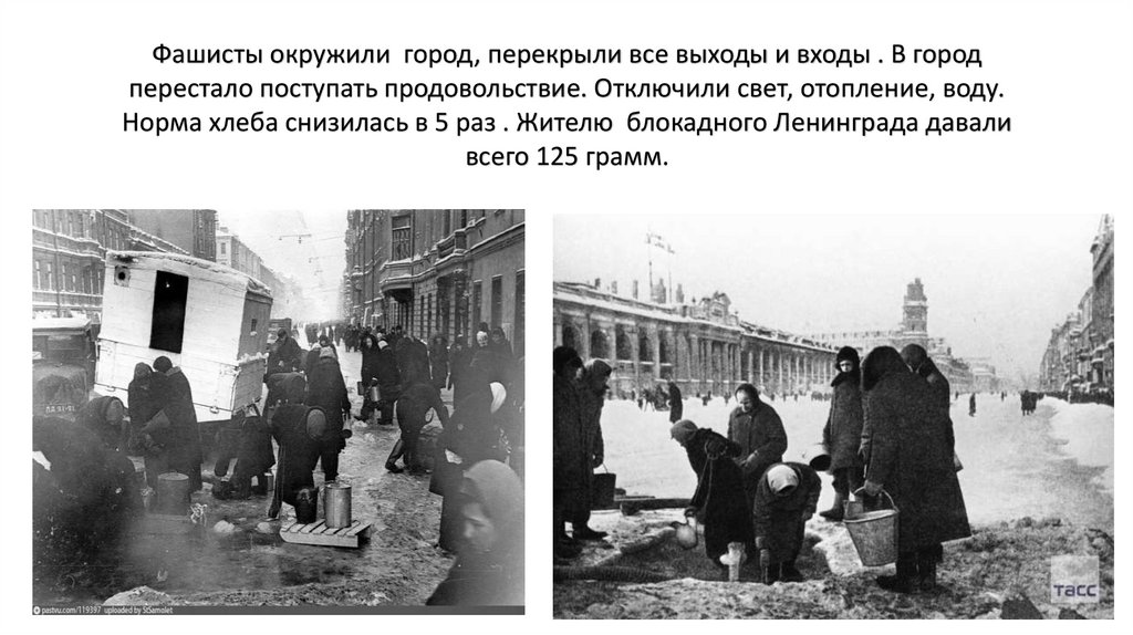 Фашисты окружили город, перекрыли все выходы и входы . В городперестало поступать продовольствие. Отключили свет, отопление, воду.
