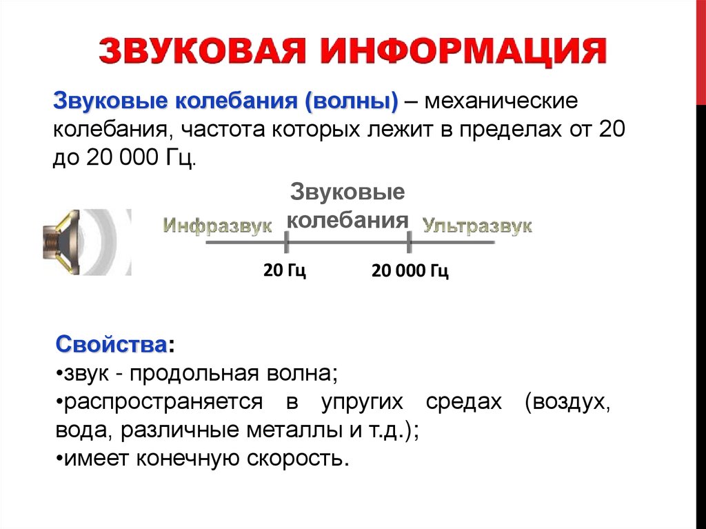 Звуковые колебания (волны) – механическиеколебания, частота которых лежит в пределах от 20