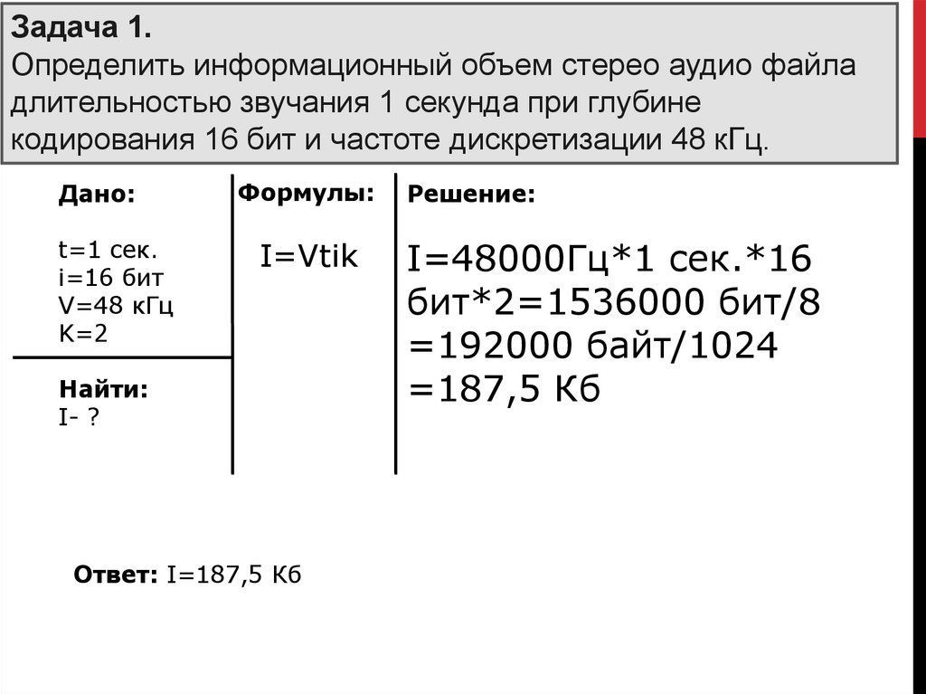 Задача 1.Определить информационный объем стерео аудио файла