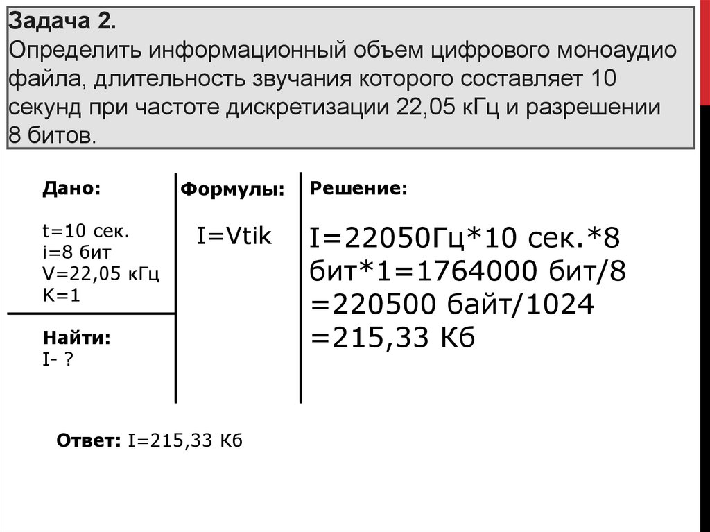 Задача 2.Определить информационный объем цифрового моноаудио