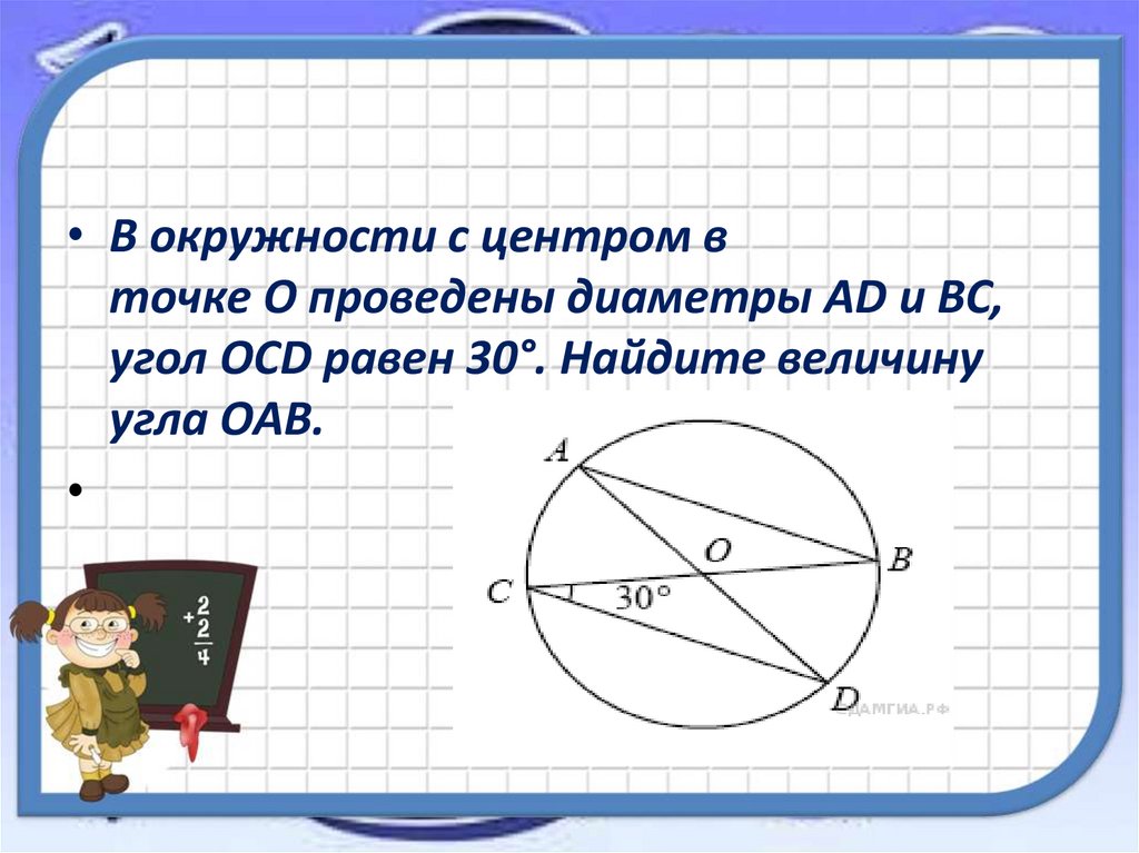 • В окружности с центром вточке О проведены диаметры AD и BC,
