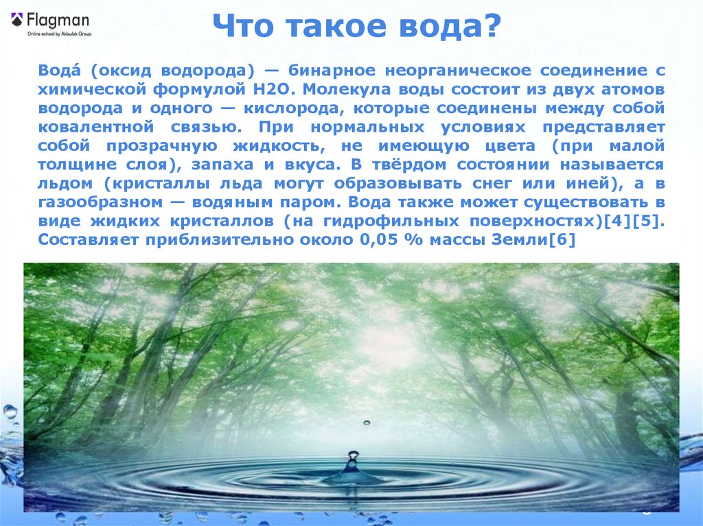 Что такое вода?Вода́ (оксид водорода) — бинарное неорганическое соединение с