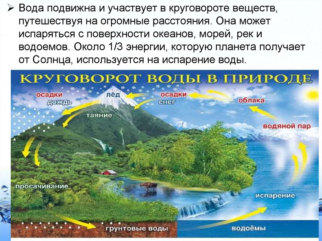 Вода подвижна и участвует в круговороте веществ,путешествуя на огромные расстояния. Она может