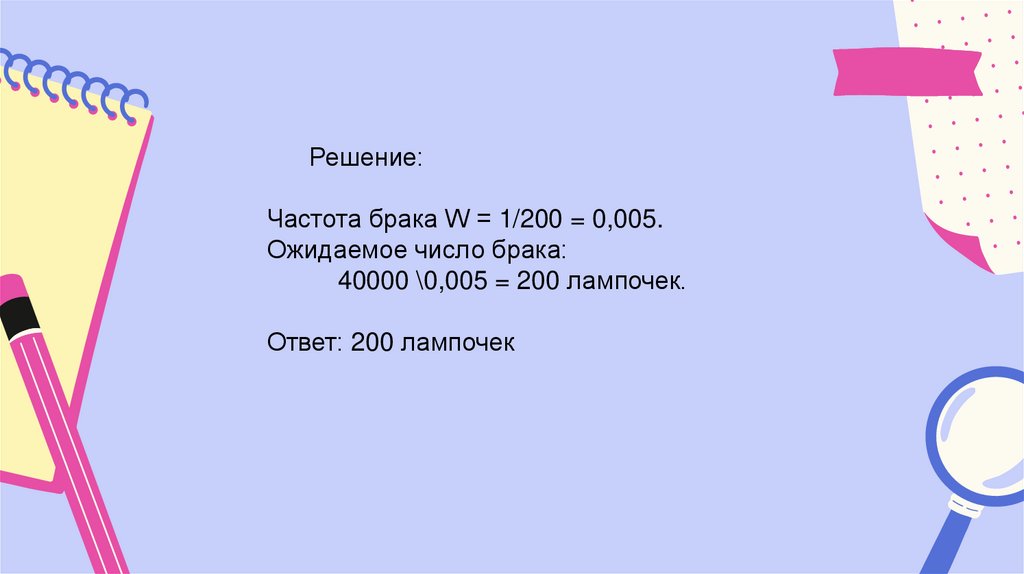 Решение:Частота брака W = 1/200 = 0,005.