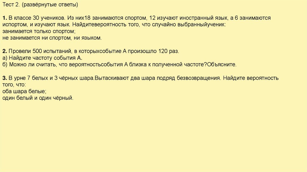 Тест 2. (развёрнутые ответы)1. В классе 30 учеников. Из них18 занимаются спортом, 12 изучают иностранный язык, а 6 занимаются