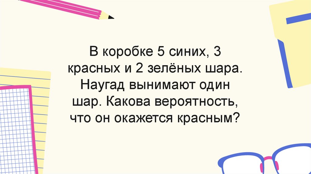 В коробке 5 синих, 3красных и 2 зелёных шара.