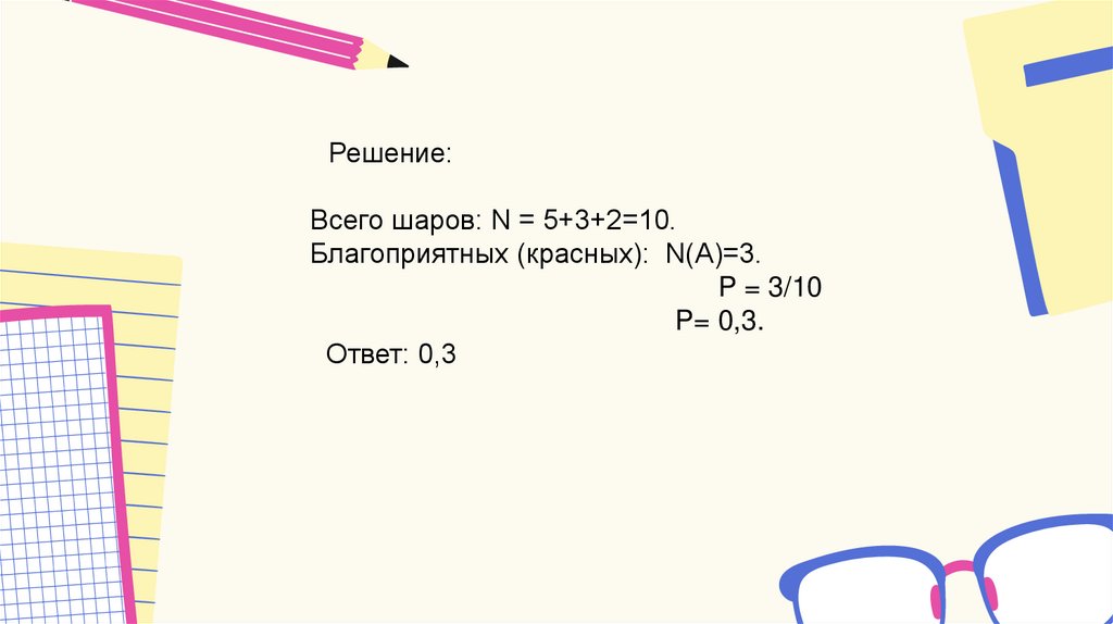 Решение:Всего шаров: N = 5+3+2=10.