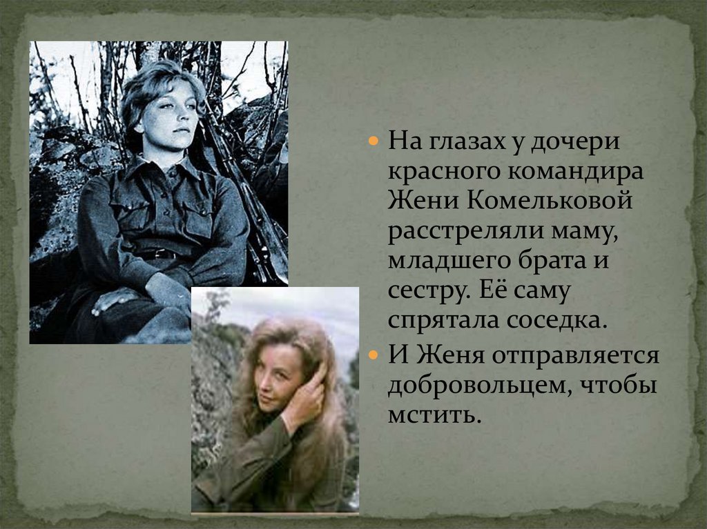 Женька Комелькова – весёлая, смешливая,озорная красавица, уставшая от войны, от боли