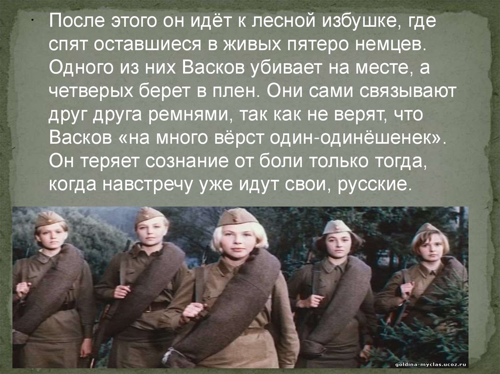 После этого он идёт к лесной избушке, гдеспят оставшиеся в живых пятеро немцев.