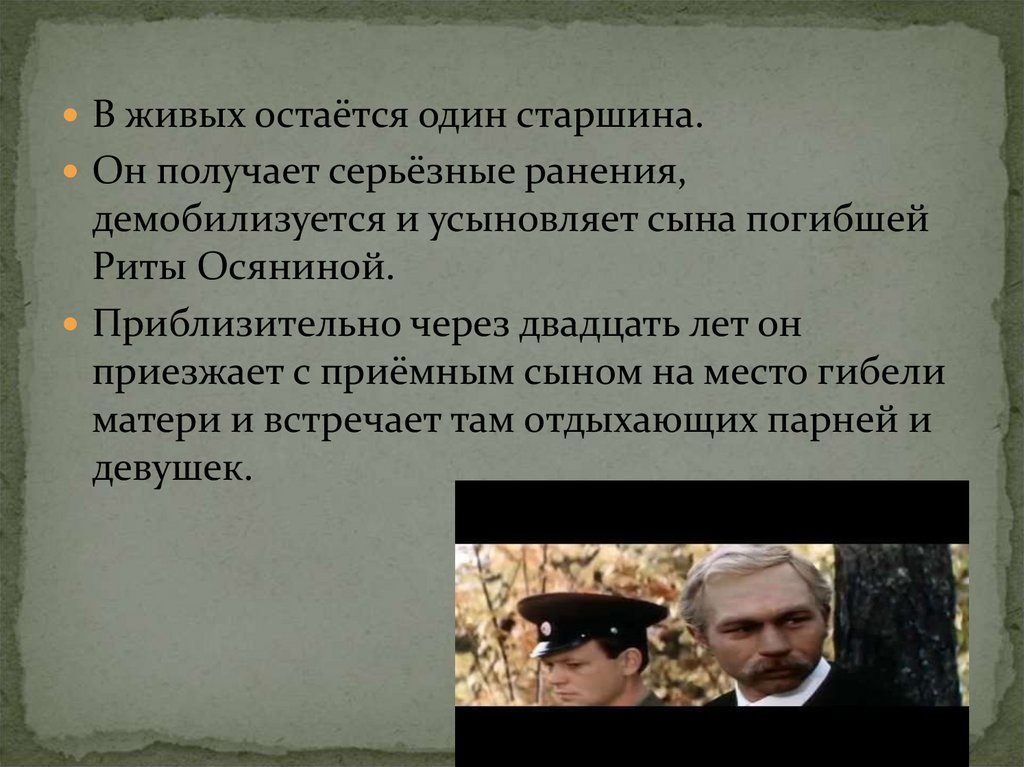 В живых остаётся один старшина.Он получает серьёзные ранения,