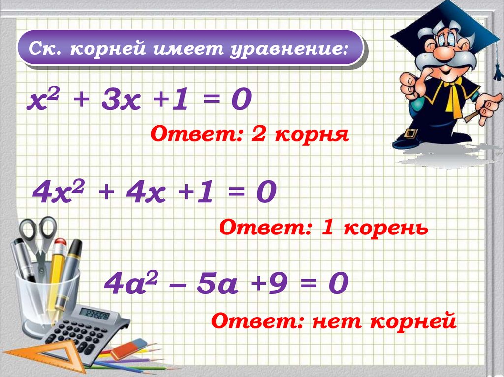 Ск. корней имеет уравнение:x2 + 3х +1 = 0