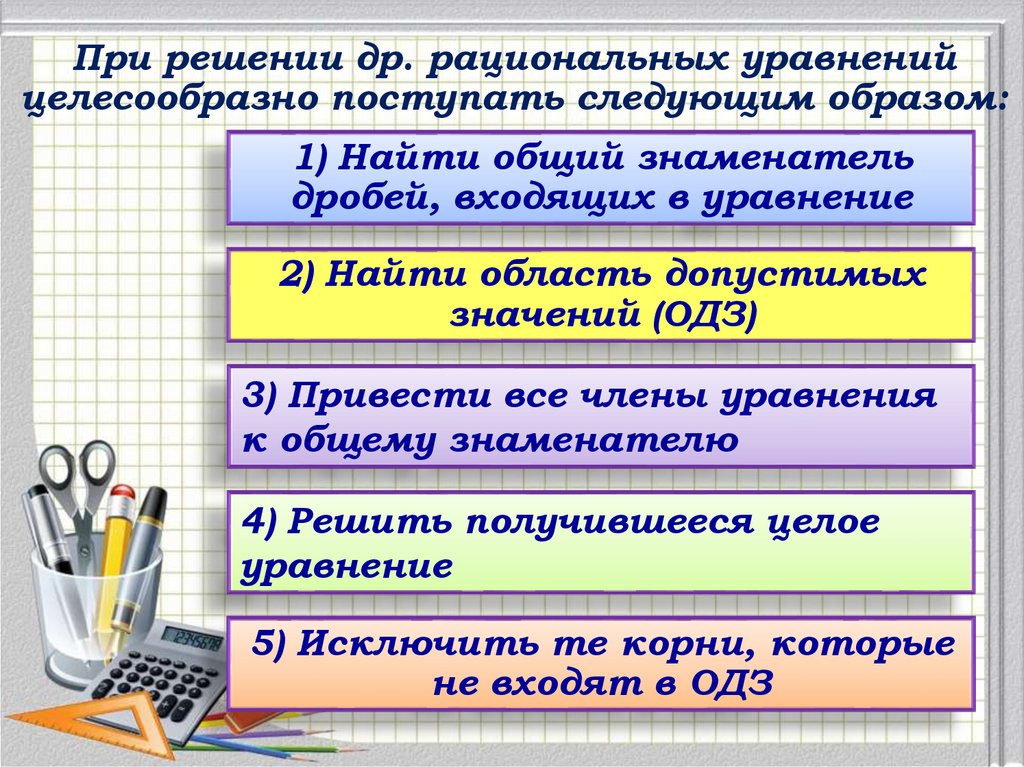 При решении др. рациональных уравненийцелесообразно поступать следующим образом: