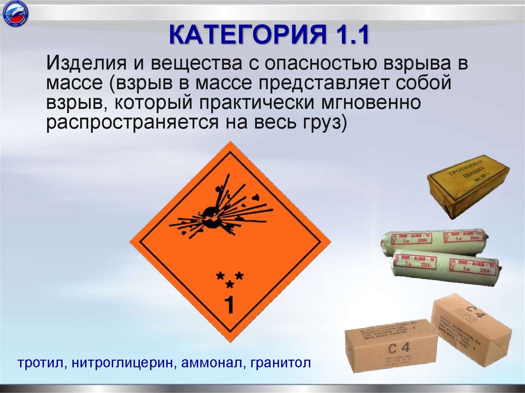КАТЕГОРИЯ 1.1Изделия и вещества с опасностью взрыва в