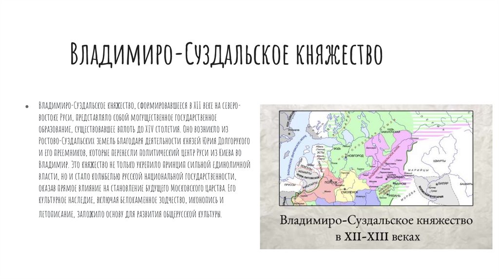 Владимиро-Суздальское княжествоВладимиро-Суздальское княжество, сформировавшееся в XII веке на северовостоке Руси, представляло собой могущественное государственное