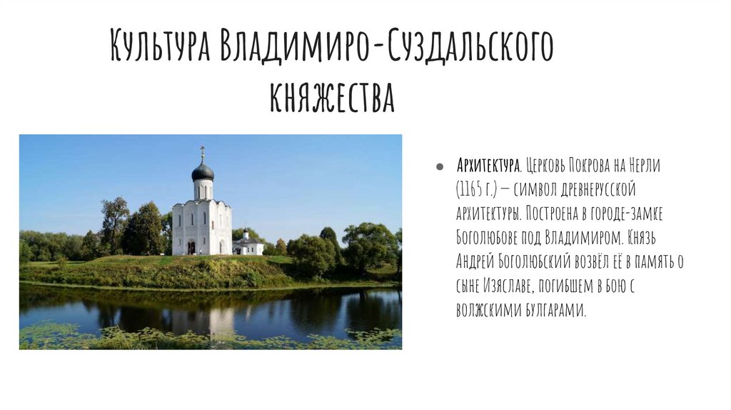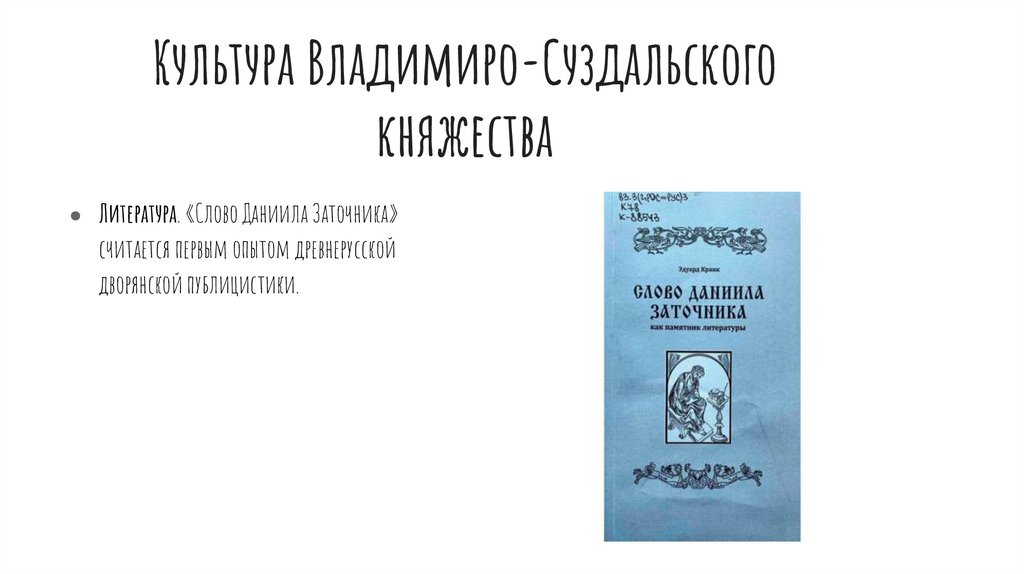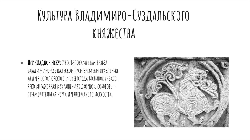 белокаменное зодчество, иконопись (владимиро-суздальская школа) и литература (например, «Слово