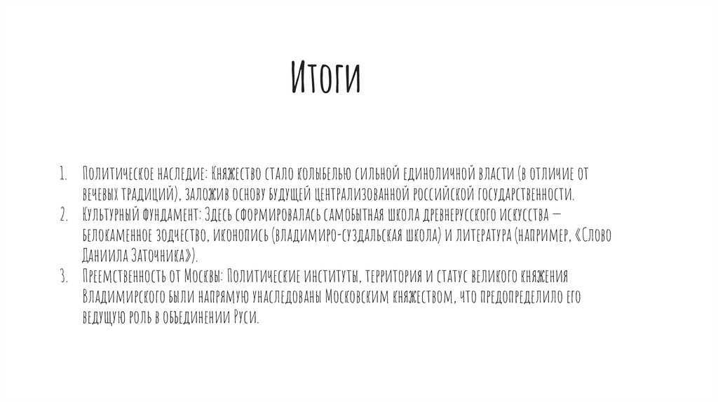 Итоги1. Политическое наследие: Княжество стало колыбелью сильной единоличной власти (в отличие от