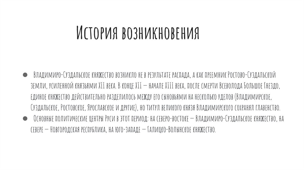 История возникновения● Владимиро-Суздальское княжество возникло не в результате распада, а как преемник Ростово-Суздальской