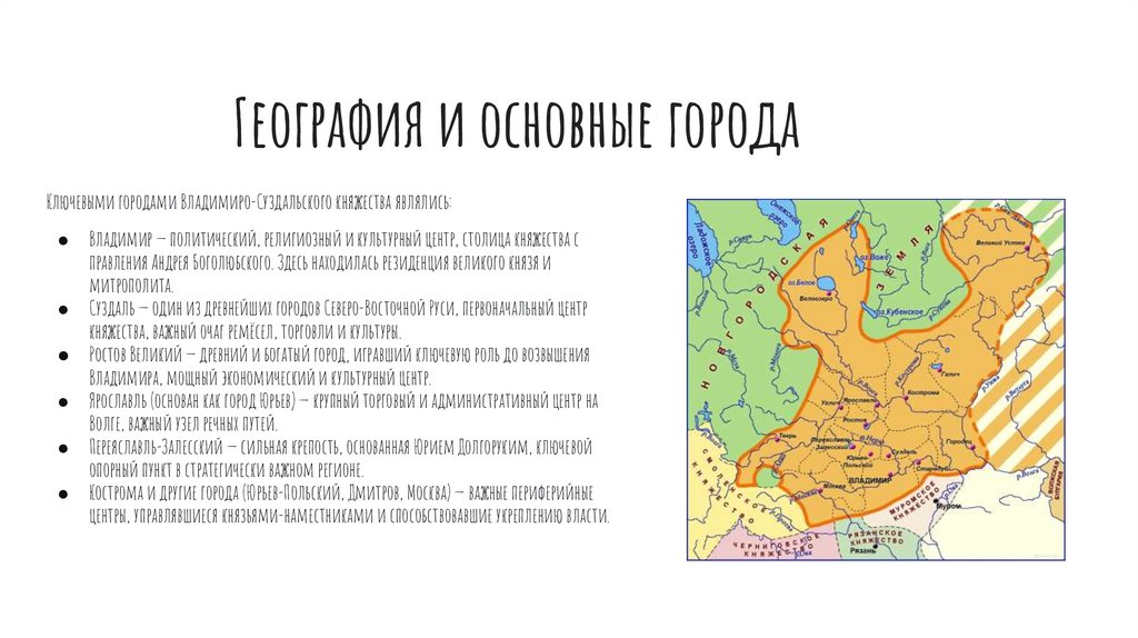 География и основные городаКлючевыми городами Владимиро-Суздальского княжества являлись: