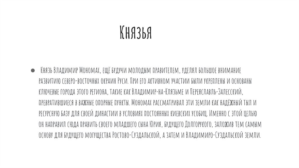 Князья● Князь Владимир Мономах, ещё будучи молодым правителем, уделял большое внимание