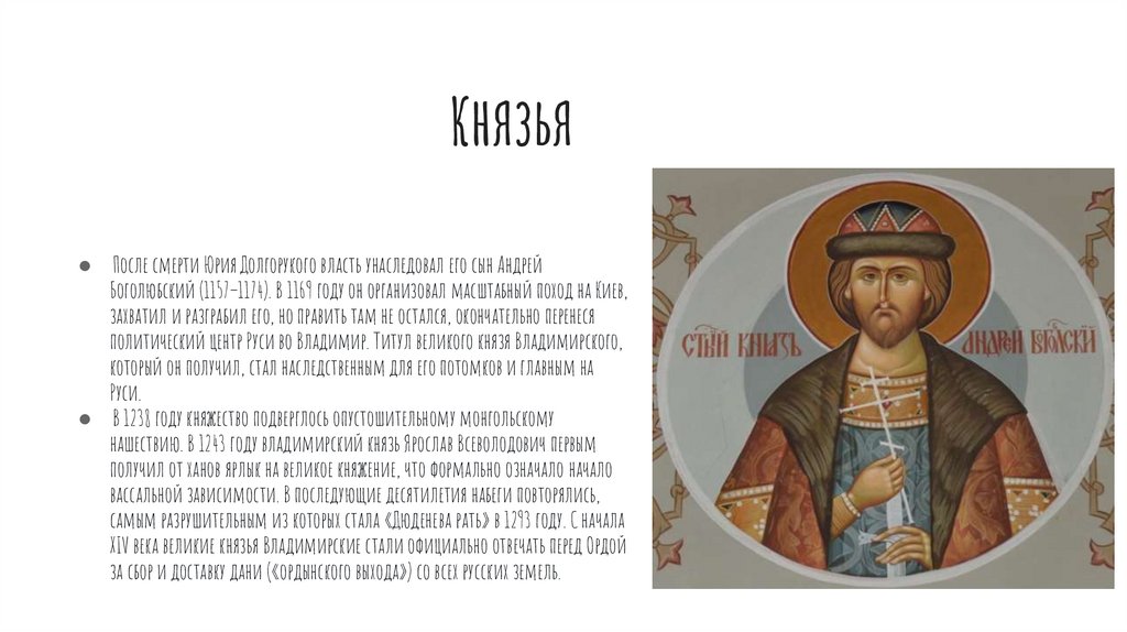 Князья● После смерти Юрия Долгорукого власть унаследовал его сын Андрей